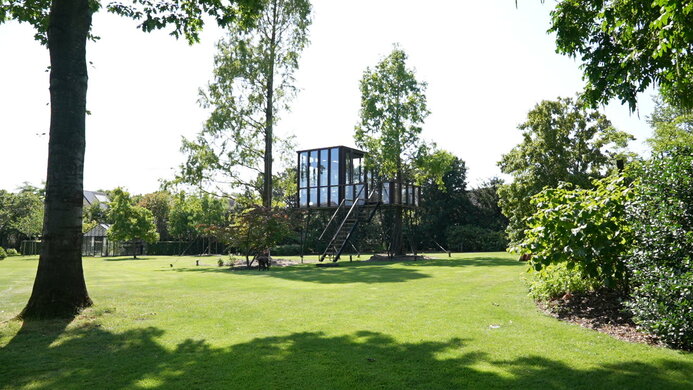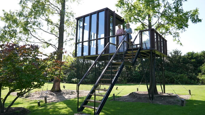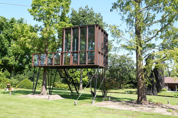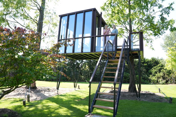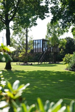 En ophøjet, sofistikeret udgave af et klassisk barndomsprojekt. HogerHuis har lavet dette moderne og ophøjede design ved hjælp af Afzelia-træ. Den har vinduer fra gulv til loft på alle sider og tager en konventionel træhytte til nye højder!