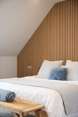 Denne master suite afsluttes perfekt med de hyggelige trælameller ved sengens hovedgærde. Selv i det tilstødende omklædningsrum giver spejlrammerne og skabsvæggene i træ et flot præg til rummet. Og som prikken over i'et blev der naturligvis anvendt Precolor Easy og Oil Plus 2C i neutrale toner!