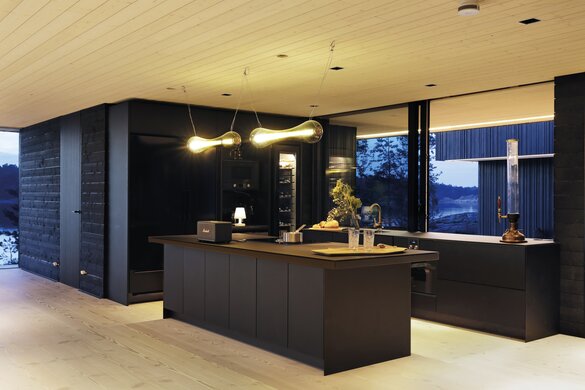 Mørke og lyse farver går igen i hele huset. De snehvide gulve skaber en fantastisk kontrast til de mørke vægge. Indenfor er de børstede granvægge behandlet med Precolor Easy i farven Intense Black i kombination med Oil Plus 2C i farven Black. Til behandling af lofterne i børstet gran og gulvene i douglas-gran blev der i modsætning til væggene valgt en lysere farve.